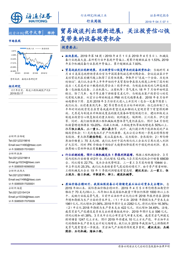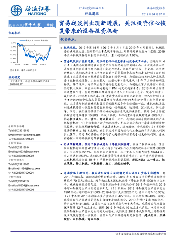 【海通证券】【20190407】20190407-海通证券-机械工业行业周报:贸易战谈判出现新进展,关注投资信心恢复带来的设备投资机会-10页