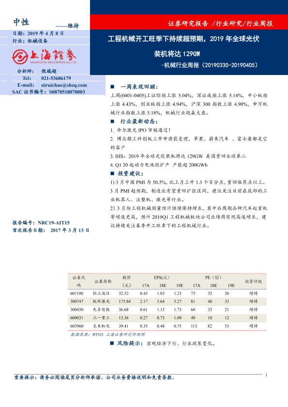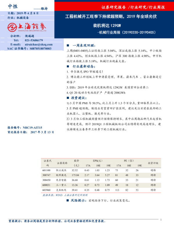 【上海证券】【20190408】20190408-上海证券-机械行业周报:工程机械开工旺季下持续超预期,2019年全球光伏装机将达129GW-6页