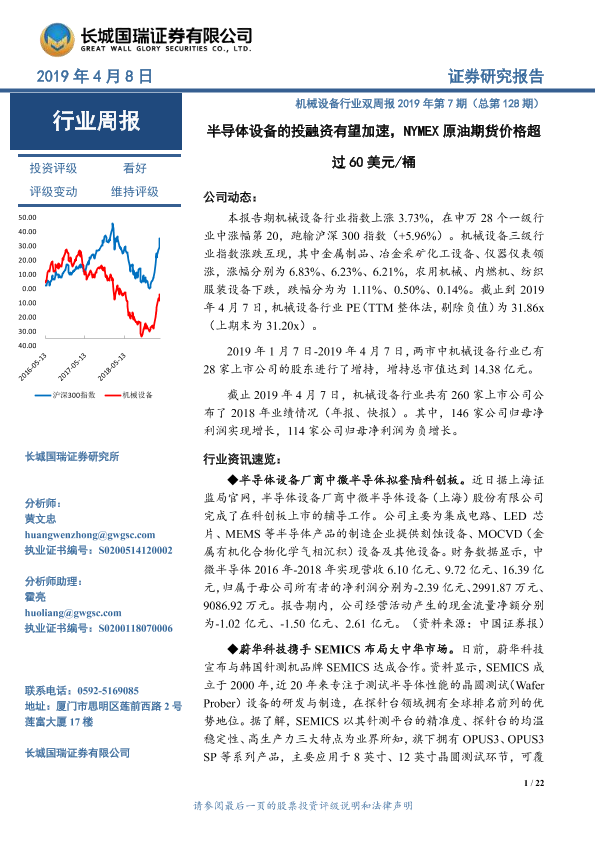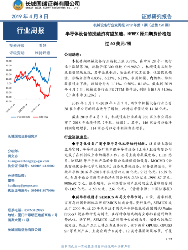 【长城国瑞证券】【20190408】机械设备行业双周报2019年第7期(总第128期):半导体设备的投融资有望加速,NYMEX原油期货价格超过60美元/桶-22页