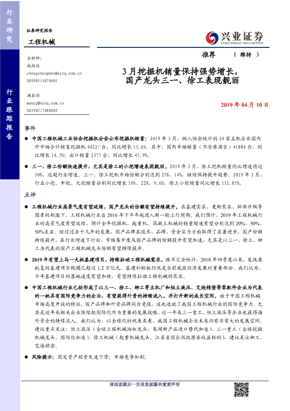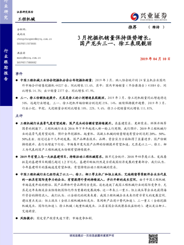 【兴业证券】【20190410】3月挖掘机销量保持强势增长,国产龙头三一、徐工表现靓丽-7页