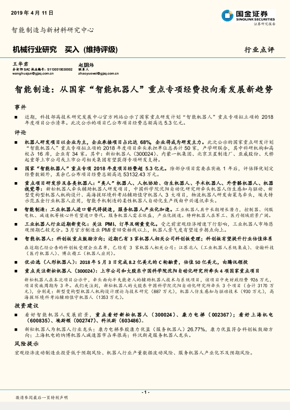 【国金证券】【20190411】智能制造:从国家“智能机器人”重点专项经费投向看发展新趋势-14页