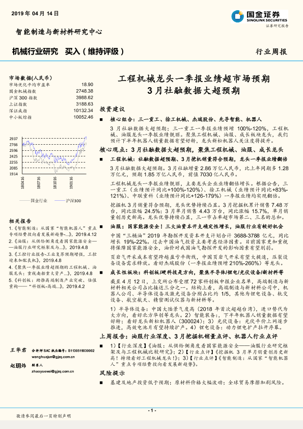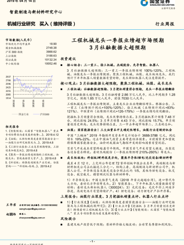 【国金证券】【20190414】机械行业研究周报:工程机械龙头一季报业绩超市场预期 3月社融数据大超预期-16页