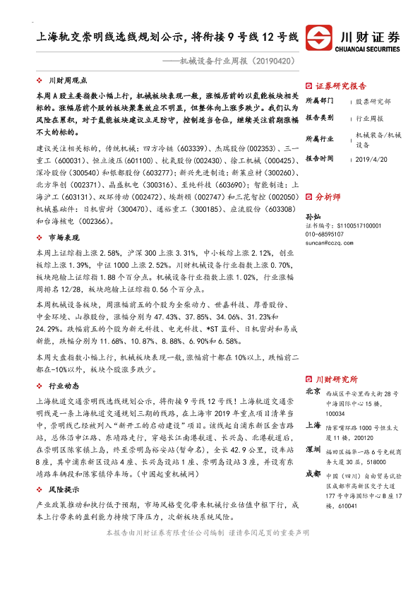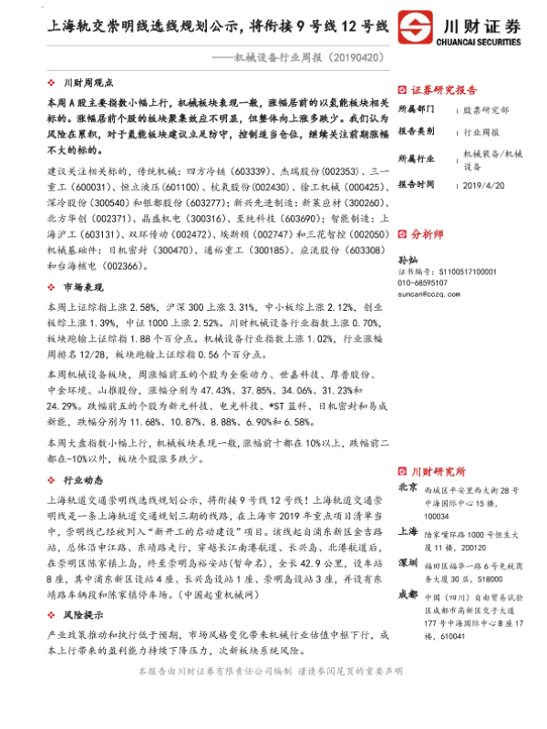 【川财证券】【20190420】机械设备行业周报:上海轨交崇明线选线规划公示,将衔接9号线12号线-9页