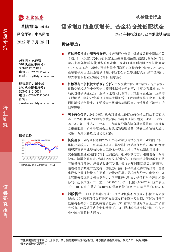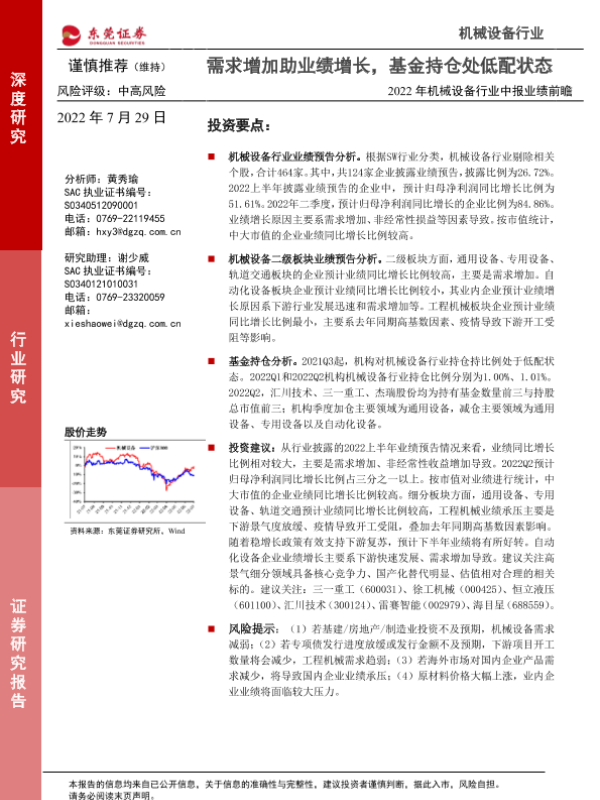 【东莞证券】【20220729】2022年机械设备行业中报业绩前瞻:需求增加助业绩增长,基金持仓处低配状态-17页