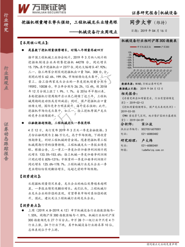 【万联证券】【20190416】20190416-万联证券-机械设备行业周观点:挖掘机销量增长势头强劲,工程机械龙头业绩亮眼-11页