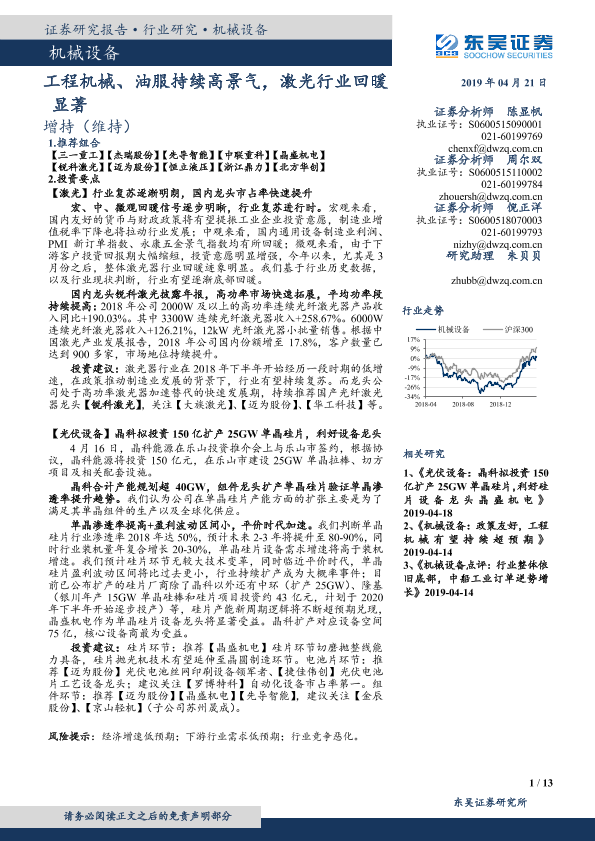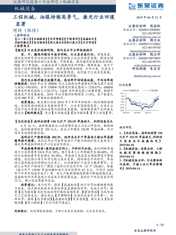 【东吴证券】【20190421】机械设备:工程机械、油服持续高景气,激光行业回暖显著-13页