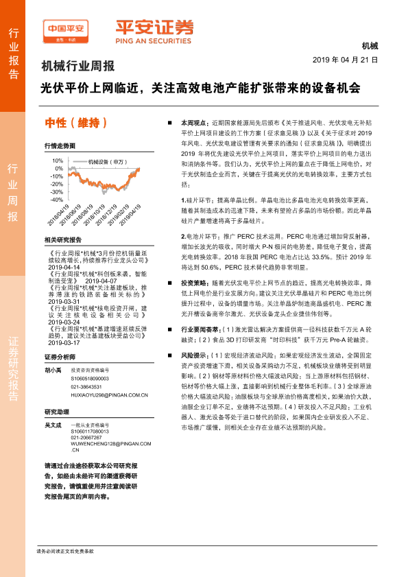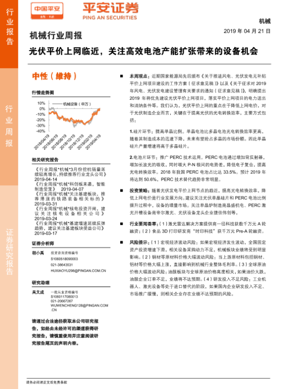 【平安证券】【20190421】机械行业周报:光伏平价上网临近,关注高效电池产能扩张带来的设备机会-4页