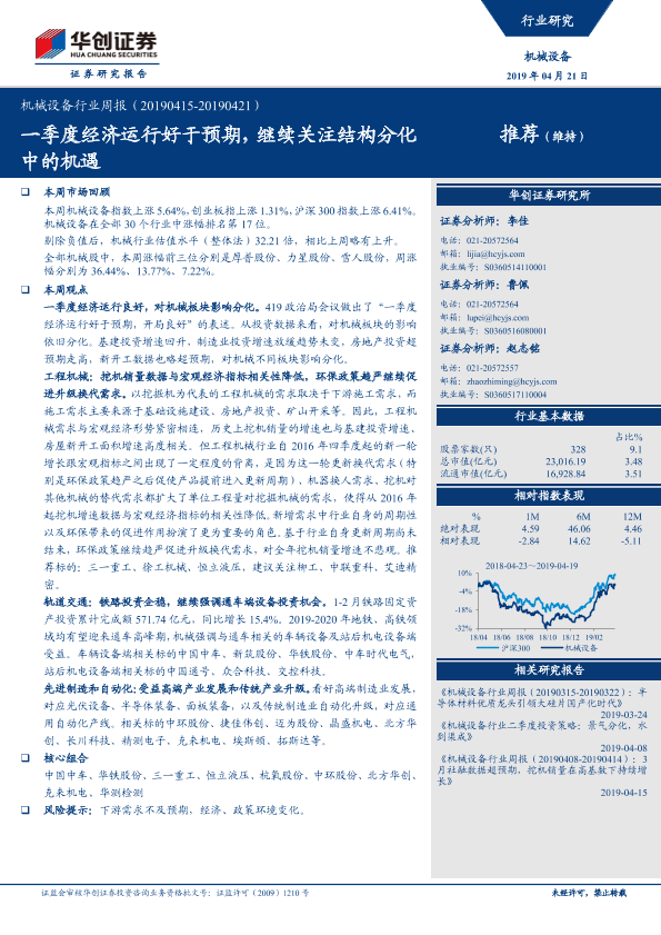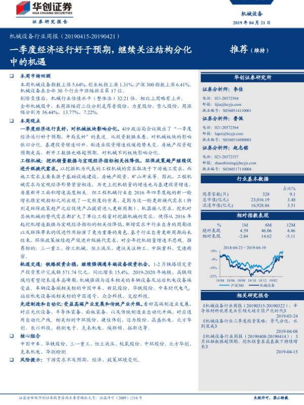 【华创证券】【20190421】20190421-华创证券-机械设备行业周报:一季度经济运行好于预期,继续关注结构分化中的机遇-18页