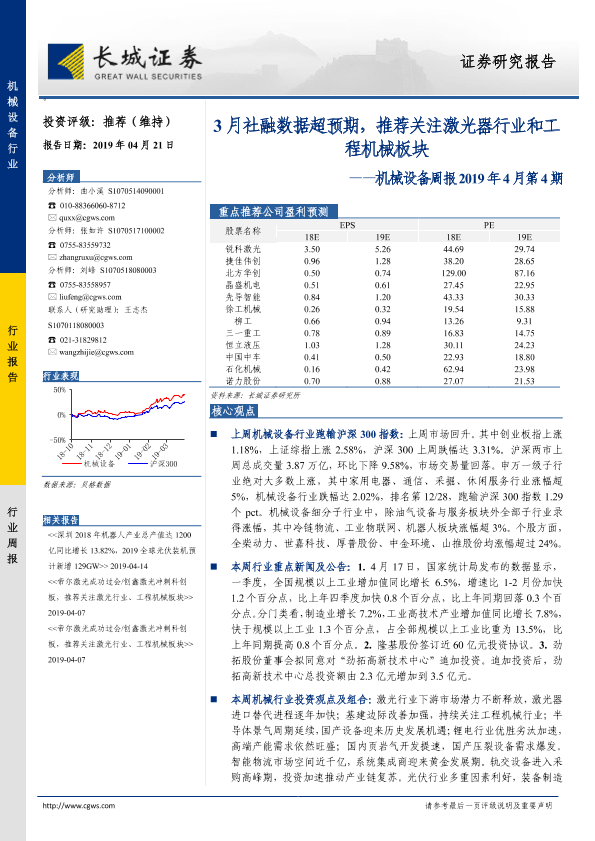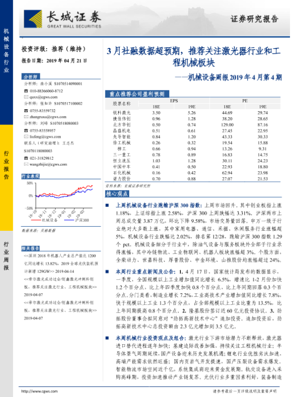 【长城证券】【20190421】机械设备周报2019年4月第4期:3月社融数据超预期,推荐关注激光器行业和工程机械板块-13页