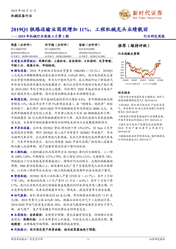 【新时代证券】【20190421】2019年机械行业周报4月第3期:2019Q1铁路运输业固投增加11%,工程机械龙头业绩靓丽-18页