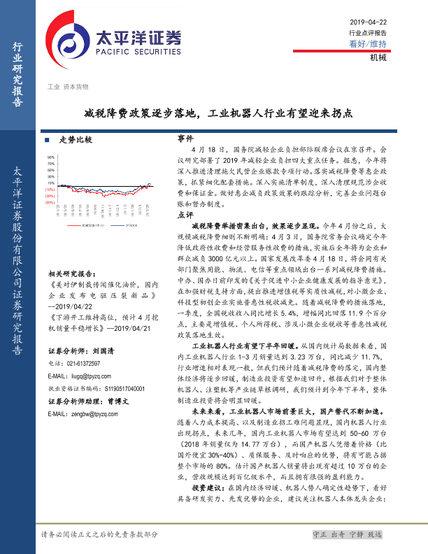 【太平洋证券】【20190422】20190422-太平洋-机械行业点评报告:减税降费政策逐步落地,工业机器人行业有望迎来拐点-5页