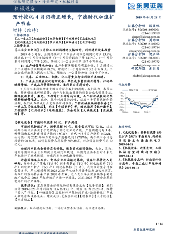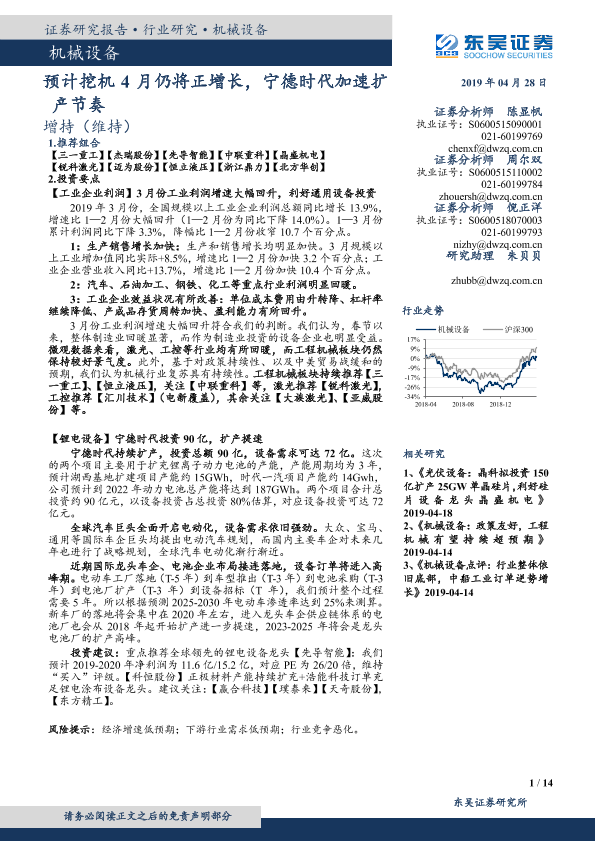 【东吴证券】【20190428】预计挖机4月仍将正增长,宁德时代加速扩产节奏-14页