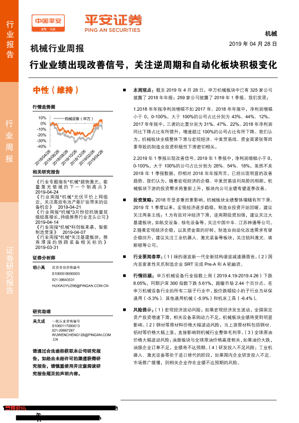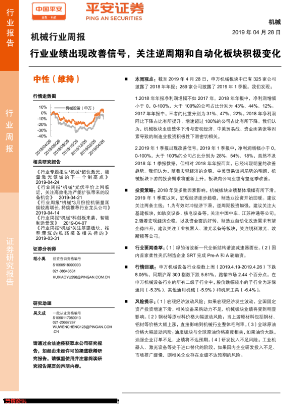 【平安证券】【20190428】机械行业周报:行业业绩出现改善信号,关注逆周期和自动化板块积极变化-4页