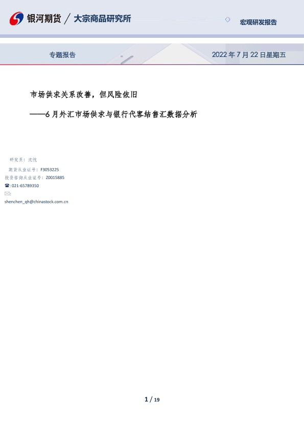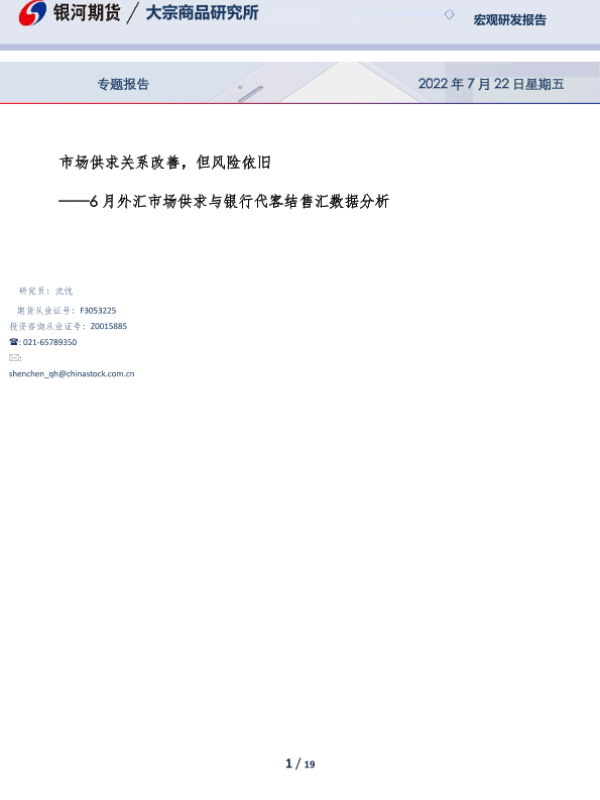 【银河期货】【20220722】6月外汇市场供求与银行代客结售汇数据分析:市场供求关系改善,但风险依旧-19页