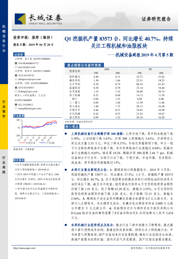 【长城证券】【20190428】机械设备周报2019年4月第5期:Q1挖掘机产量83573台,同比增长40.7%,持续关注工程机械和油服板块-12页