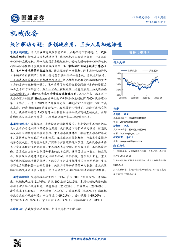 【国盛证券】【20190505】20190505-国盛证券-机械设备行业周报:线性驱动专题:多领域应用,巨头入局加速渗透-15页