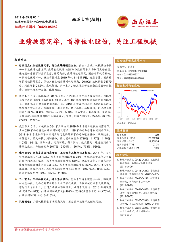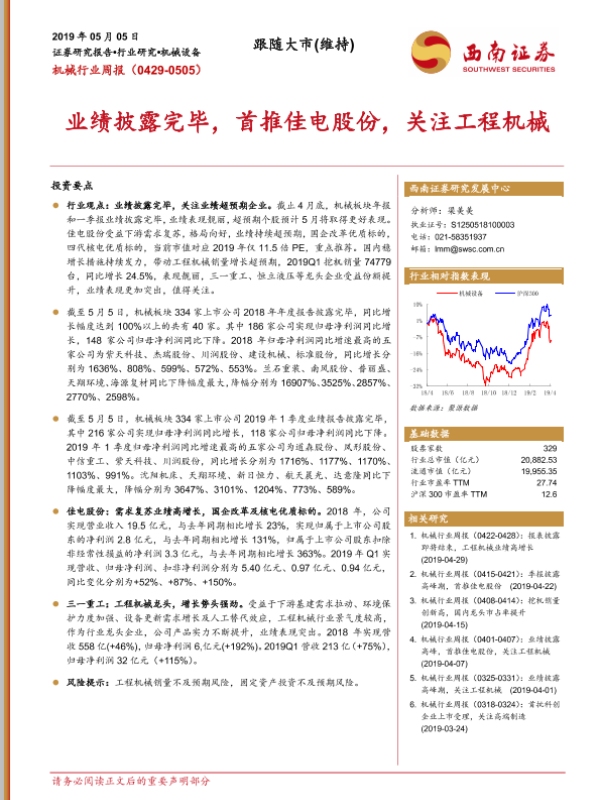 【西南证券】【20190505】机械行业周报:业绩披露完毕,首推佳电股份,关注工程机械-13页