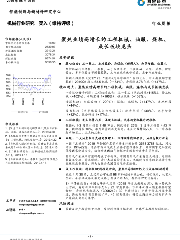 【国金证券】【20190506】20190506-国金证券-机械行业研究周报:聚焦业绩高增长的工程机械、油服、煤机、成长板块龙头-19页
