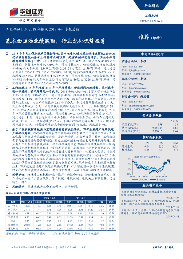 【华创证券】【20190506】工程机械行业2018年报及2019年一季报总结:基本面强劲业绩靓丽,行业龙头优势显著-24页