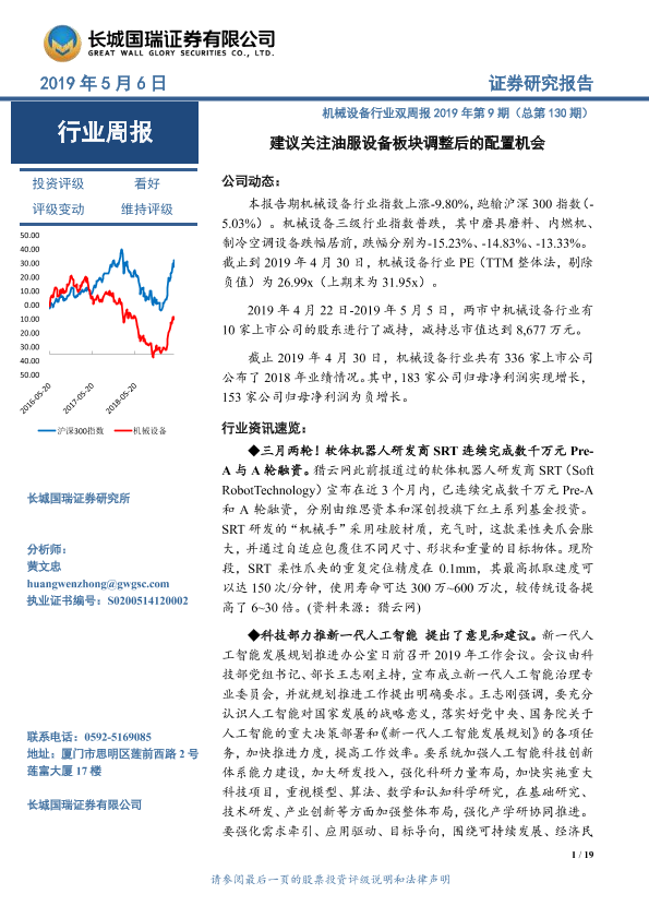 【长城国瑞证券】【20190506】机械设备行业双周报2019年第9期(总第130期):建议关注油服设备板块调整后的配置机会-19页