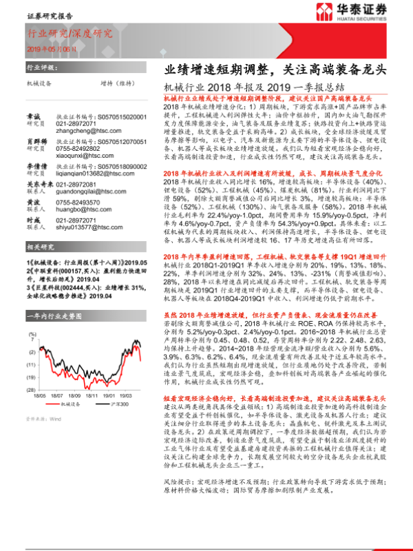 【华泰证券】【20190506】机械行业2018年报及2019一季报总结:业绩增速短期调整,关注高端装备龙头-18页