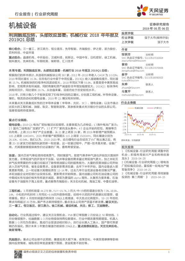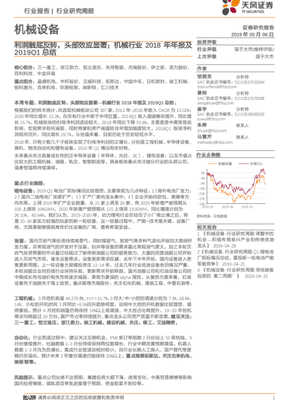 【天风证券】【20190506】机械设备行业研究周报:利润触底反转,头部效应显著:机械行业2018年年报及2019Q1总结-23页