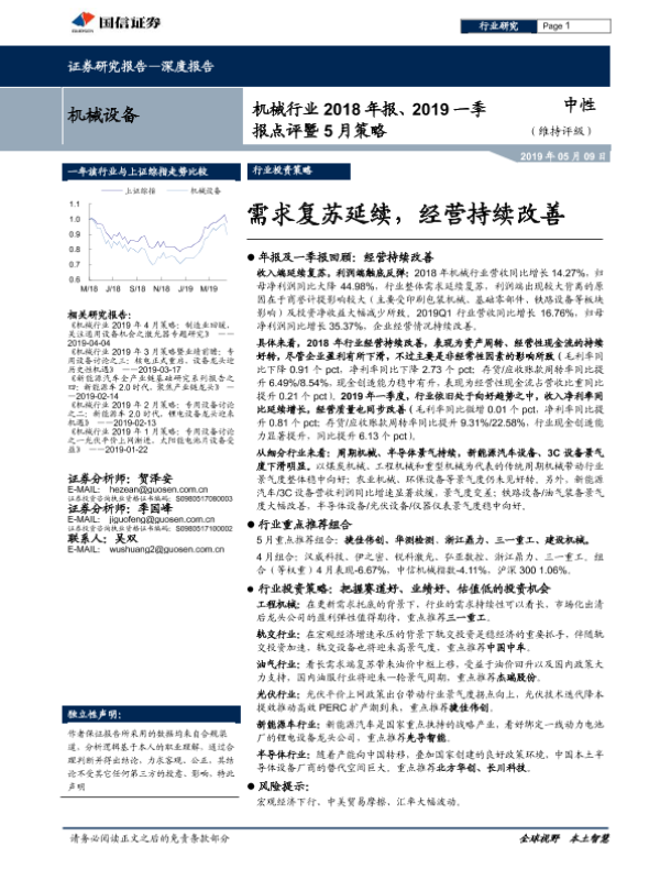 【国信证券】【20190509】机械行业2018年报、2019一季报点评暨5月策略:需求复苏延续,经营持续改善-23页