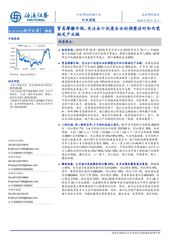【海通证券】【20190512】20190512-海通证券-机械工业行业周报:贸易摩擦升级,关注出口优质企业的调整应对和内需相关产业链-11页