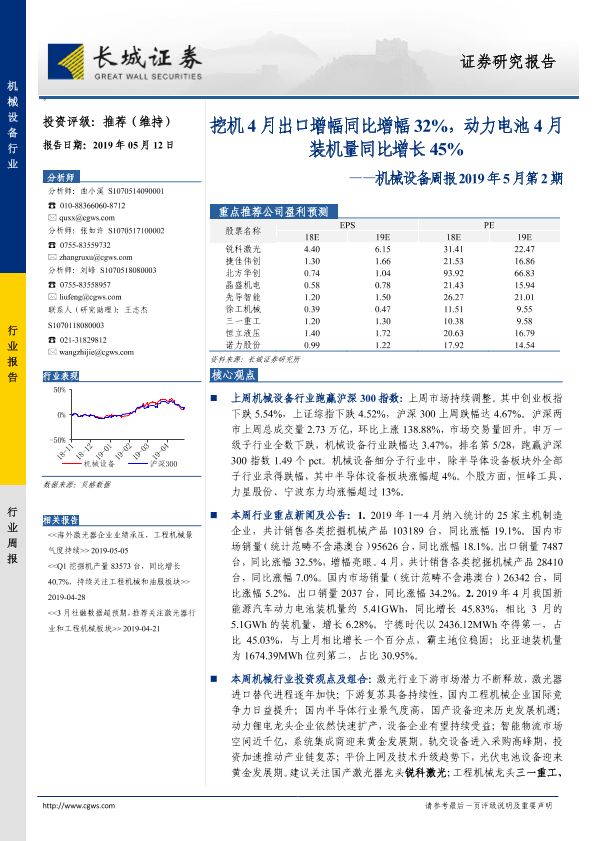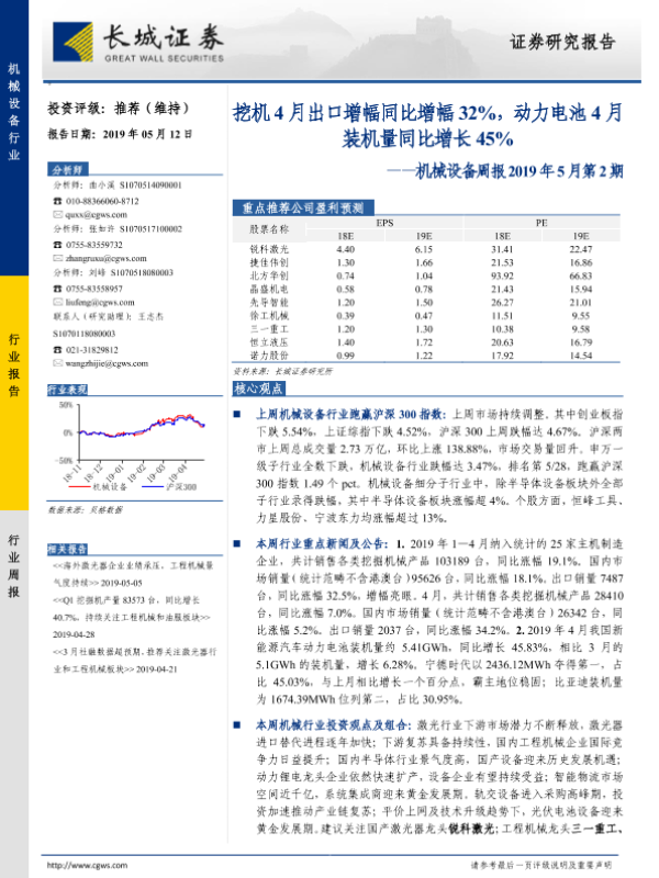 【长城证券】【20190512】机械设备周报2019年5月第2期:挖机4月出口增幅同比增幅32%,动力电池4月装机量同比增长45%-11页