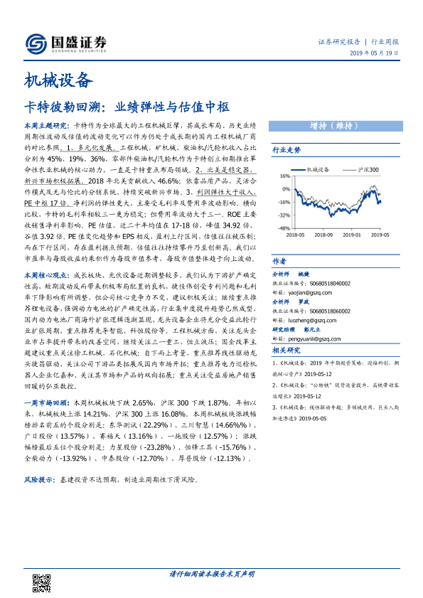 【国盛证券】【20190519】机械设备行业周报:卡特彼勒回溯:业绩弹性与估值中枢-16页