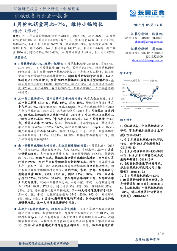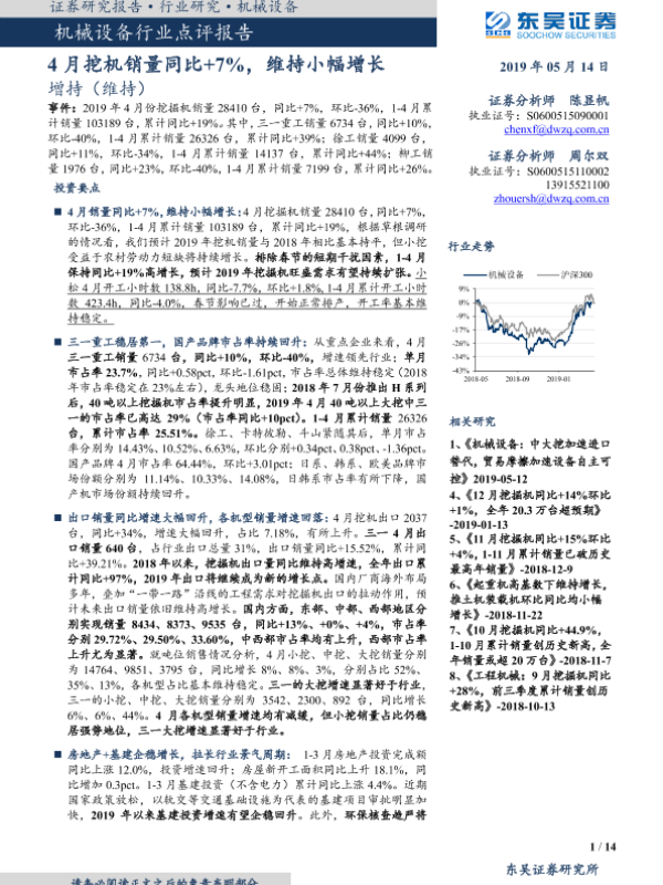 【东吴证券】【20190514】机械设备行业点评报告:4月挖机销量同比+7%,维持小幅增长-14页