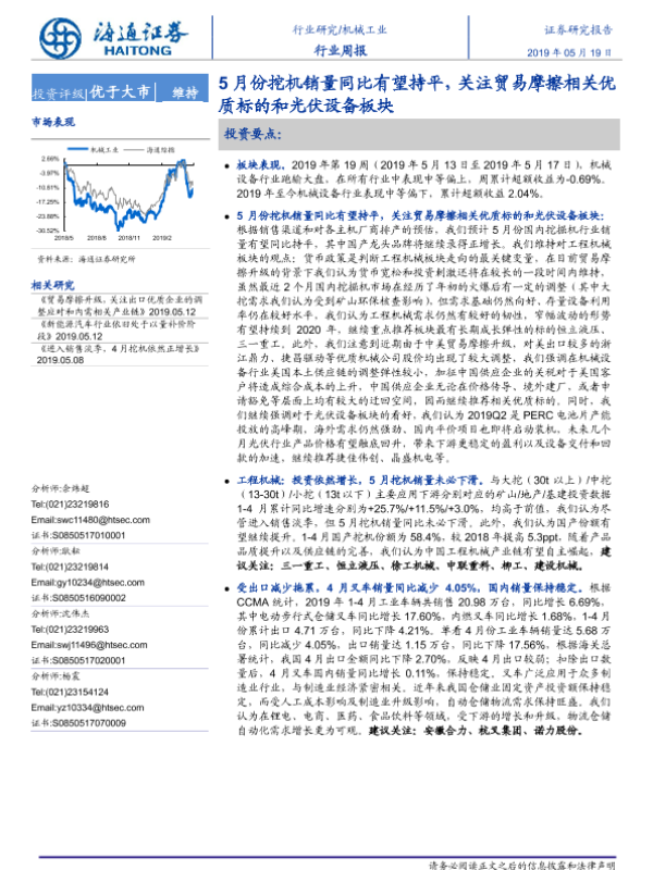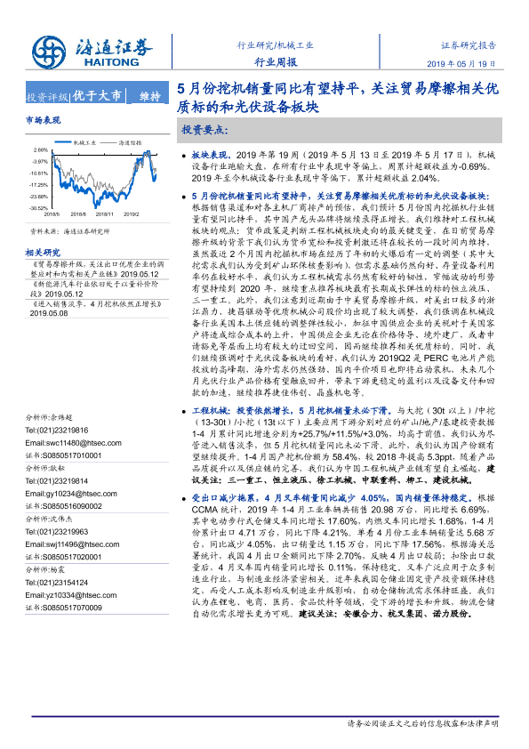 【海通证券】【20190519】20190519-海通证券-机械工业行业周报:5月份挖机销量同比有望持平,关注贸易摩擦相关优质标的和光伏设备板块-11页