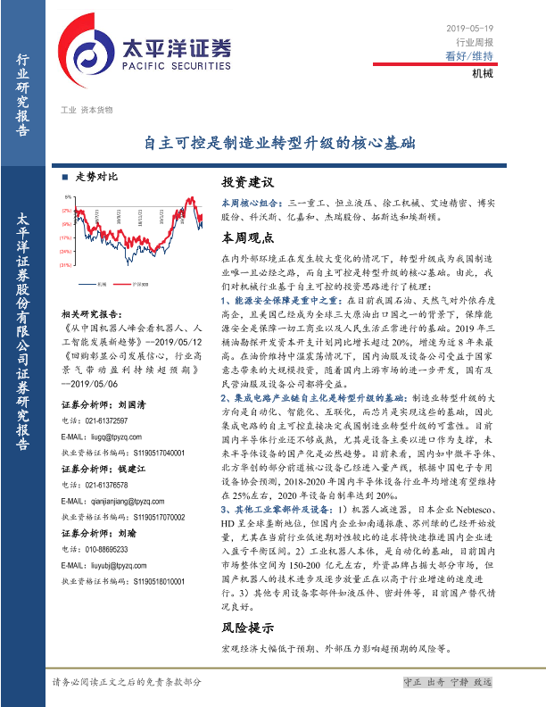 【太平洋证券】【20190519】机械行业周报:自主可控是制造业转型升级的核心基础-10页
