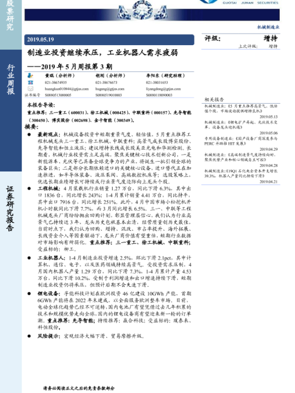 【国泰君安证券】【20190519】机械制造业2019年5月周报第3期:制造业投资继续承压,工业机器人需求疲弱-32页