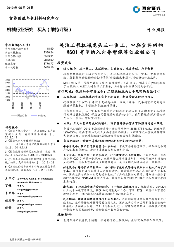 【国金证券】【20190526】20190526-国金证券-机械行业研究:关注工程机械龙头三一重工、中联重科回购MSCI有望纳入先导智能等创业板公司-16页