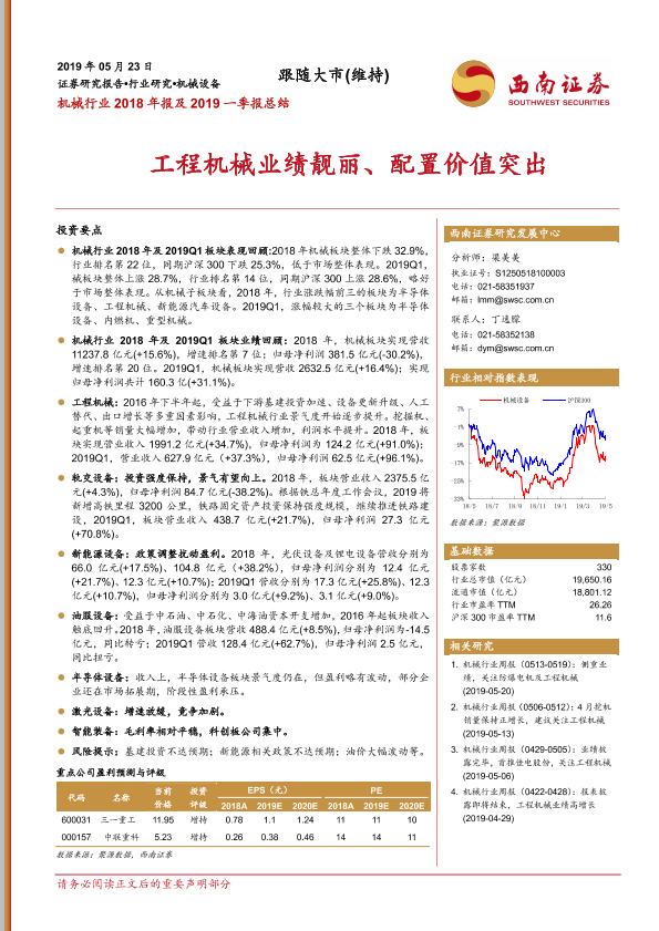 【西南证券】【20190523】机械行业2018年报及2019一季报总结:工程机械业绩靓丽、配置价值突出-33页