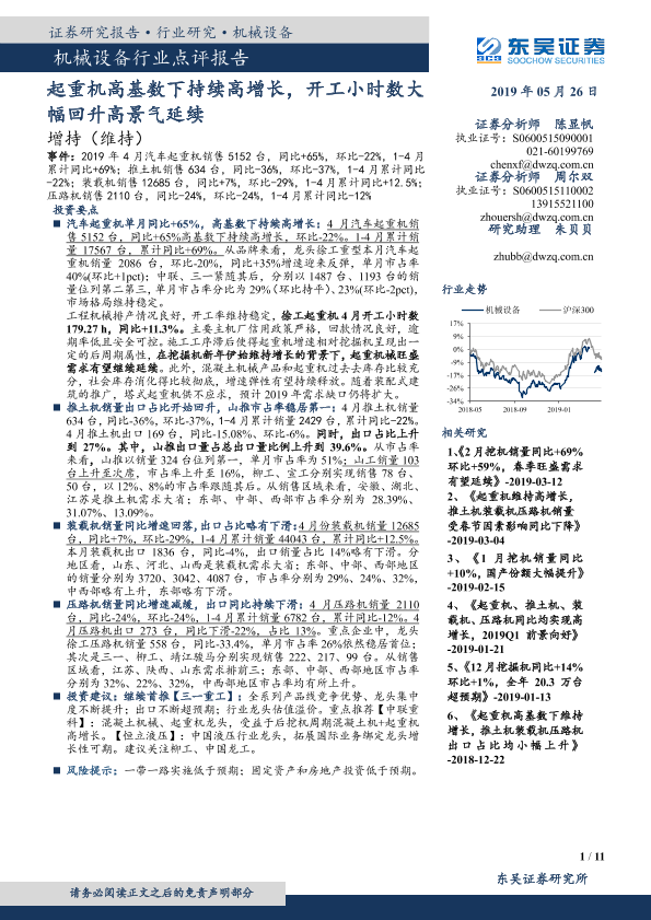 【东吴证券】【20190526】20190526-东吴证券-机械设备行业点评报告:起重机高基数下持续高增长,开工小时数大幅回升高景气延续-11页