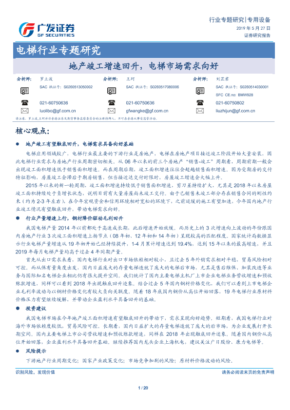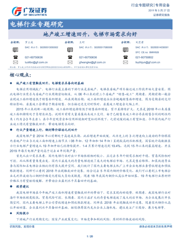 【广发证券】【20190527】20190527-广发证券-电梯行业专题研究:地产竣工增速回升,电梯市场需求向好-20页