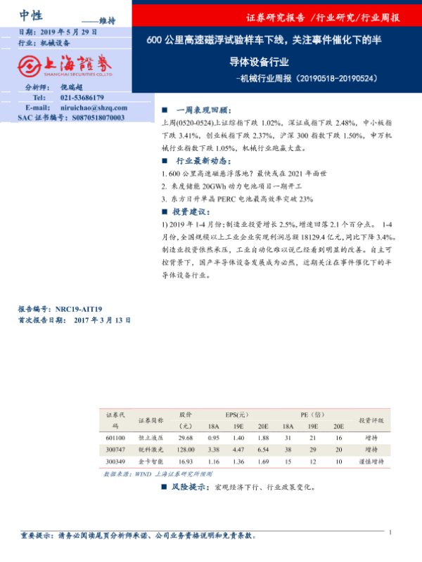 【上海证券】【20190529】20190529-上海证券-机械行业周报:600公里高速磁浮试验样车下线,关注事件催化下的半导体设备行业-5页