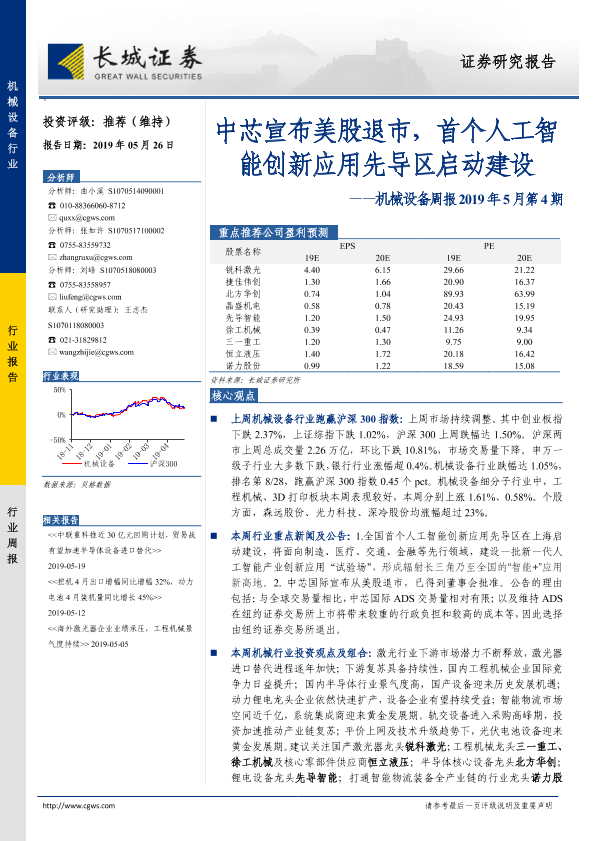【长城证券】【20190526】长城证券-机械设备周报2019年5月第4期:中芯宣布美股退市,首个人工智能创新应用先导区启动建设-11页