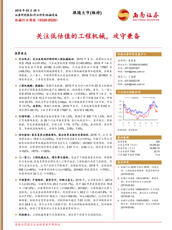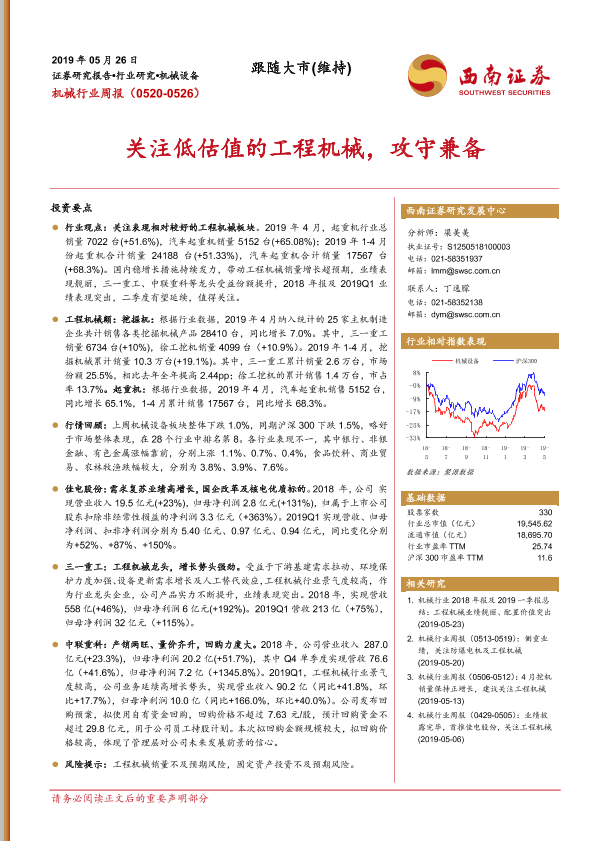 【西南证券】【20190526】机械行业周报:关注低估值的工程机械,攻守兼备-10页
