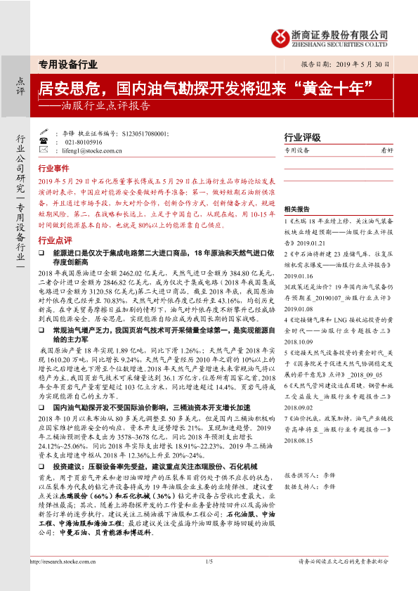 【浙商证券】【20190530】居安思危,国内油气勘探开发将迎来“黄金十年”-5页