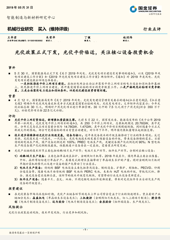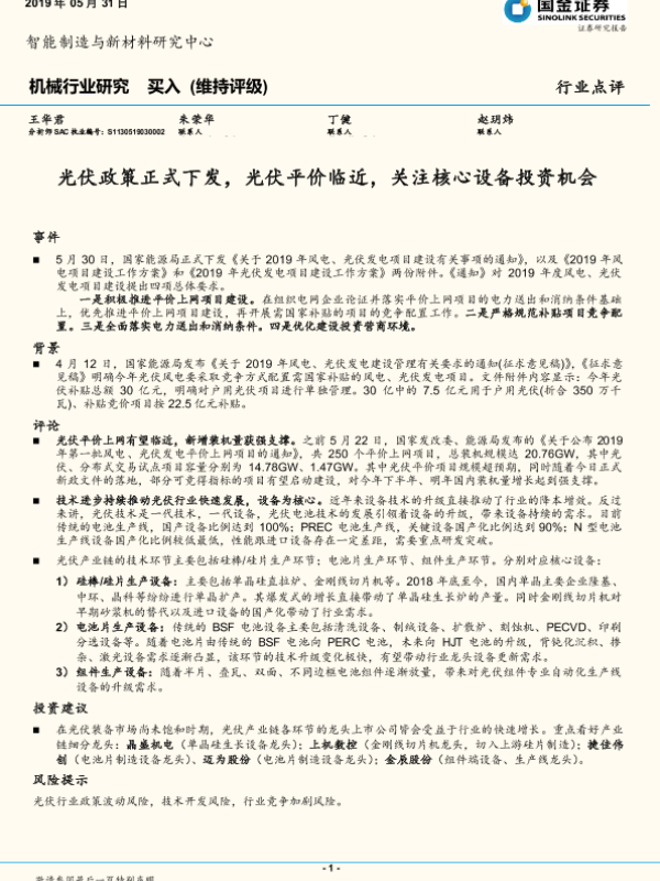 【国金证券】【20190531】机械行业研究:光伏政策正式下发,光伏平价临近,关注核心设备投资机会-3页