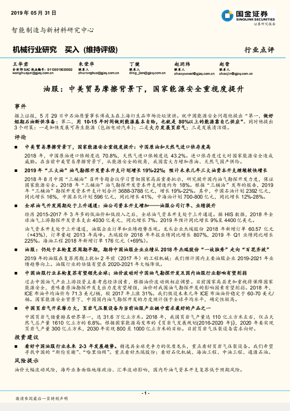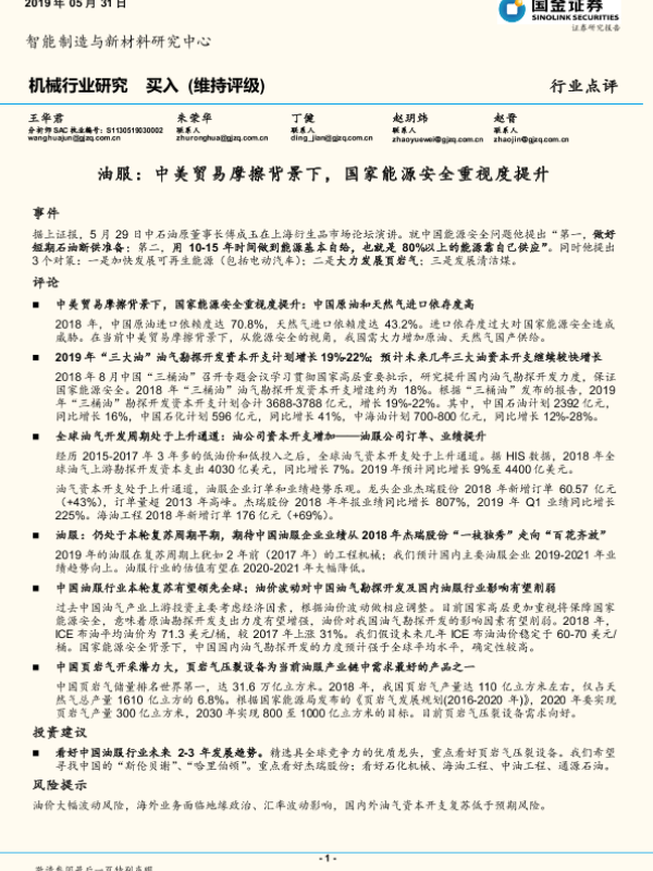 【国金证券】【20190531】机械行业研究:油服:中美贸易摩擦背景下,国家能源安全重视度提升-3页
