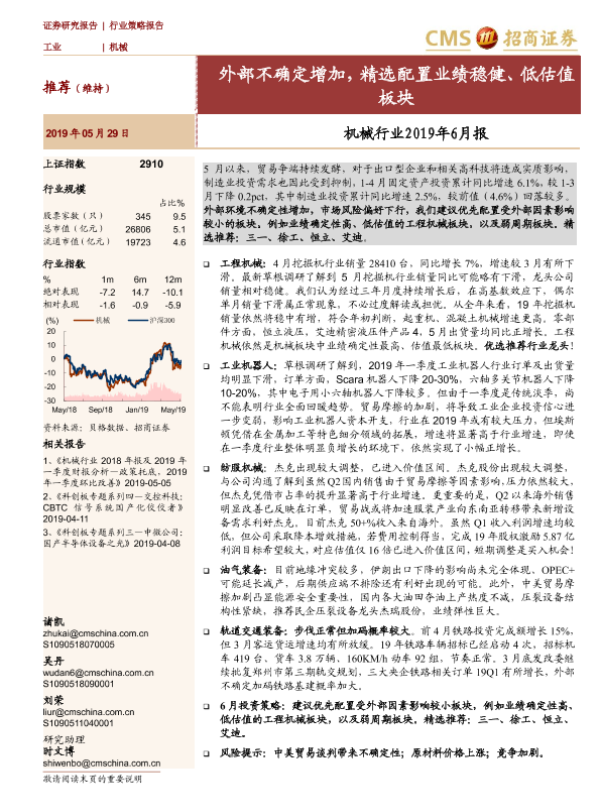 【海通证券】【20190529】机械行业2019年6月报:外部不确定增加,精选配置业绩稳健、低估值板块-26页
