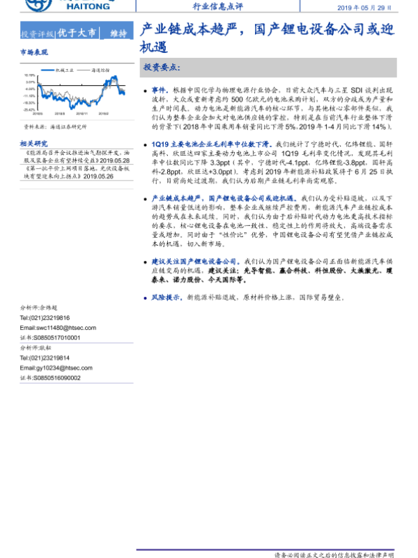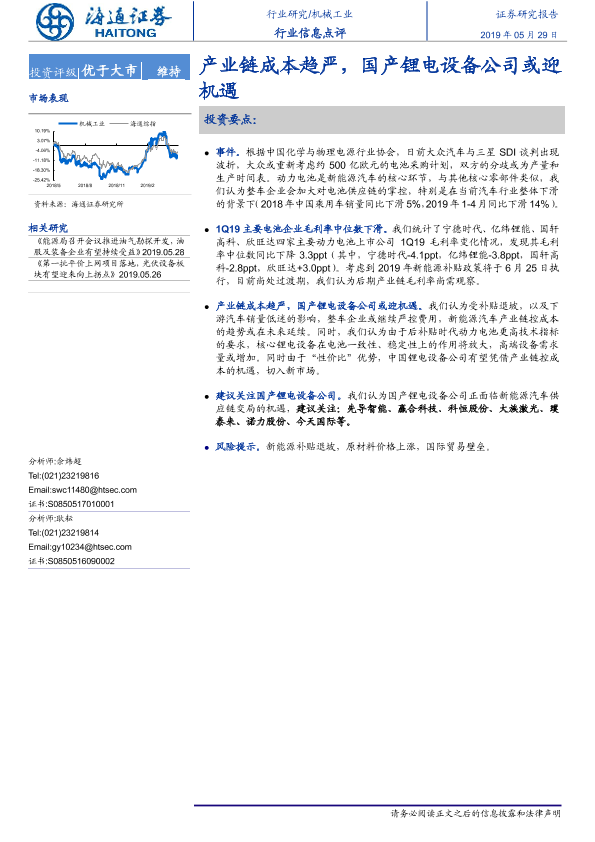 【海通证券】【20190529】机械工业行业信息点评:产业链成本趋严,国产锂电设备公司或迎机遇-2页