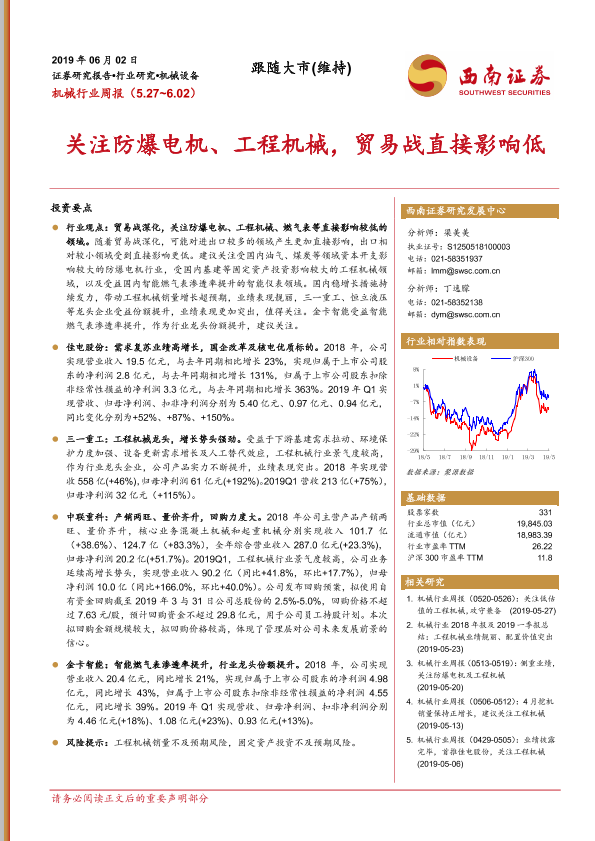 【西南证券】【20190602】20190602-西南证券-机械行业周报:关注防爆电机、工程机械,贸易战直接影响低-11页