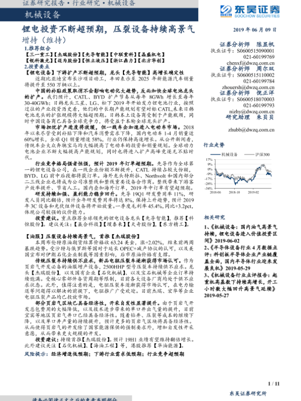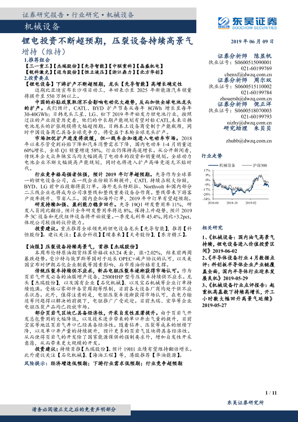【东吴证券】【20190609】20190609-东吴证券-机械设备行业跟踪周报:锂电投资不断超预期,压裂设备持续高景气-11页