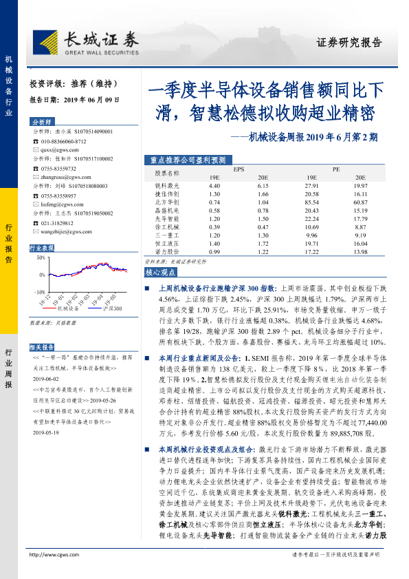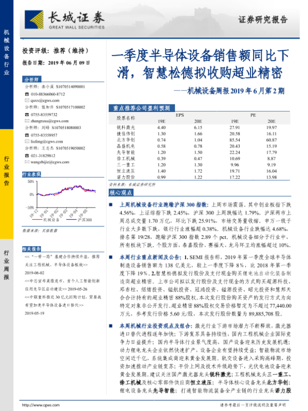 【长城证券】【20190609】机械设备周报2019年6月第2期:一季度半导体设备销售额同比下滑,智慧松德拟收购超业精密-12页