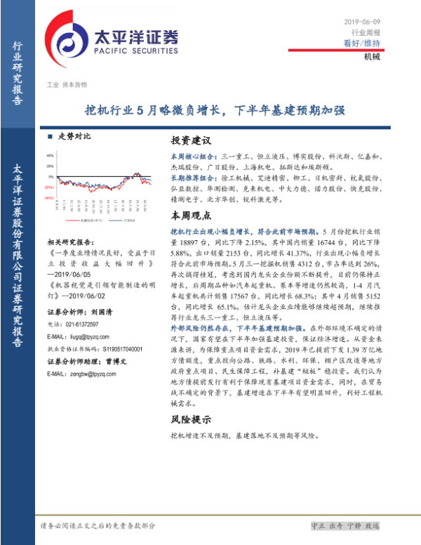 【太平洋证券】【20190609】机械行业周报:挖机行业5月略微负增长,下半年基建预期加强-11页